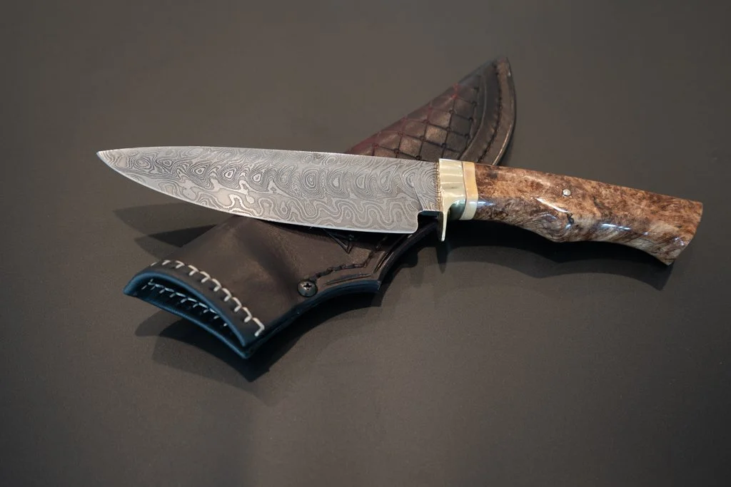 This was a build from Black Horse Forge, Radelow Knives, and Artisan Dad. Black horse forge provided the damascus billet, and handle materials, The Artisan Dad did forging of blade, shaping, heat treating, etching, handle fit up and shaping, guard and final grind, sharpening and custom sheath, Radelow Blades did the preliminary post heat treat grind.